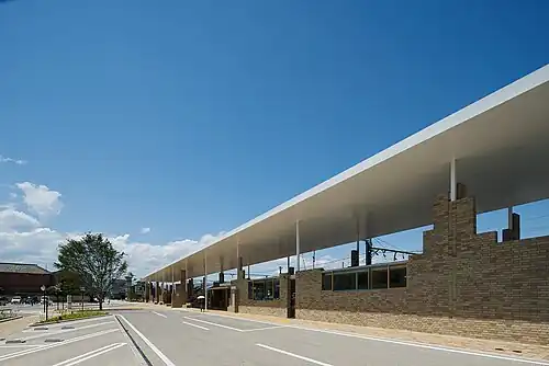 The station has a single side platform and a single island platform, connected to the station building by a level crossing.