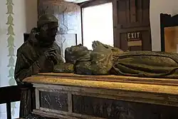 Cenotaph of Saint Junípero Serra in the Mission San Carlos Borromeo, Carmel-by-the-Sea (1924); Fr. Juan Crespí, who predeceased Serra, stands at the head, praying over him.