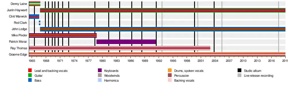 The Moody Blues were an English progressive rock band from Birmingham. Formed in May 1964, the group originally consisted of guitarist and vocalist Denny Laine, keyboardist and vocalist Mike Pinder, woodwind player and vocalist Ray Thomas, bassist Clint Warwick, and drummer Graeme Edge. The band remained active until late 2018, when sole constant member Edge retired from performing, at which point the lineup also included 1966 additions Justin Hayward on guitar and vocals, and John Lodge on bass and vocals. For their final few tours, the core trio were augmented by touring members Norda Mullen on flute, guitar and percussion (from 2003), Julie Ragins on keyboards, guitar, saxophone and percussion (from 2006), Alan Hewitt on keyboards (from 2010), and Billy Ashbaugh on drums and percussion (from 2016).