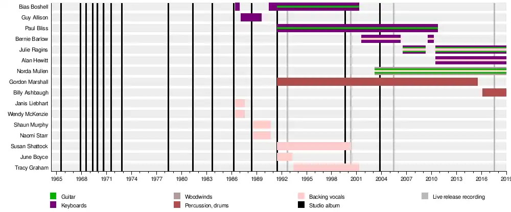 | Mike Pinder | 1964–1978 (died 2024)[23][7][8] |