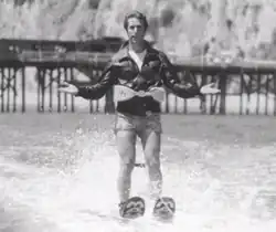 In a 2019 interview with NPR, Henry Winkler (Fonzie) told Terry Gross that the origin of the stunt began with the fact that he had been a water-skiing instructor as a teenager at a summer camp.[2] Thus, his father used to say to him "every day for years—tell Garry Marshall that you water ski. Dad, I don't think I'm going to do that. No, no. Tell him you water ski. It's very important. I finally tell Garry, my father wants you to know I water ski."[2] Winkler did all of the water skiing for the scene himself, except for the actual jump. The jump was performed by professional water skier Ricky McCormick. [2] Gross then asked Winkler what it was "about that scene or that episode that came to signify when something's time is up—when it's over?" Winkler responded: "You know what? I don't know. To them, the Fonz water skiing was just like the last straw. The only thing is it wasn't to the audience because we were No. 1 for years after that. So it didn't much matter to anybody."[2] In addition, Winkler told TheWrap in 2018 that he is "not embarrassed" by the phrase. He stated that "newspapers would mention jumping the shark ... and they would show a picture of me in my leather jacket and swim shorts water-skiing. And at that time I had great legs. So I thought, 'I don't care.' And we were No. 1 for the next four or five years."[3] As Winkler's character Barry Zuckerkorn, in the sitcom Arrested Development, hopped over a shark in episode 13 of the second season, Winkler also noted that there "was a book, there was a board game and it is an expression that is still used today ... [and] I'm very proud that I am the only actor, maybe in the world, that has jumped the shark twice—once on Happy Days, and once on Arrested Development."[3]