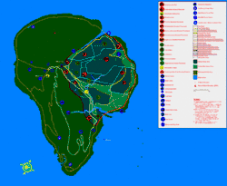 Fan-made map of Isla Nublar as presented in the film adaptation of Jurassic Park, reconciling various sources. The layouts differ in the novel, videogames and Jurassic World, but the overall shape of the island is always an inverted teardrop.