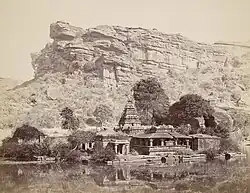1880s photograph of cliff overlooking the Bhutanatha temple on the eastern end of the artificial lake in Badami. The Kappe Arabhatta inscription is carved on a cliff overlooking the northeast end.