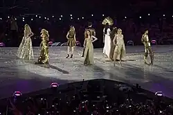 Elson, Kate Moss, Naomi Campbell, Lily Cole, Jourdan Dunn, Georgia May Jagger, David Gandy and Stella Tennant pose during the closing ceremony of the 2012 London Summer Olympics