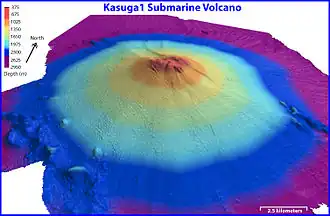 Kasuga 1 is a seamount and active volcano of the Mariana volcanic arc. It rises 3,000 m (9,800 ft) above the seafloor to about 600 m (2,000 ft) beneath the ocean surface. The volcano represents the northernmost of the three that forms the Kasuga seamount chain and is located southeast of Fukujin. Its last confirmed eruption was in July 1959 which produced pumice and another possible eruption may have occurred in 1975 when discolored water was observed around the seamount. Based on the samples of basalt and andesite collected at the summit, it is the oldest of the seamounts.[1]