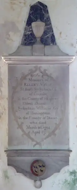 In the time of the Devon historian Polwhele (1760–1838), Priory was the seat of St Barbe Sydenham[22] (died 1757),[23] He was the only son of Humphrey Sydenham and was the possessor of Combe in 1791.[24] He married his cousin Ellery Williams (1727–1794), eldest daughter of Sydenham Williams of Herringston House[25][26] in the parish of Winterborne Herringston in Dorset, whose mural monument survives in Broadhembury Church, inscribed as follows:
