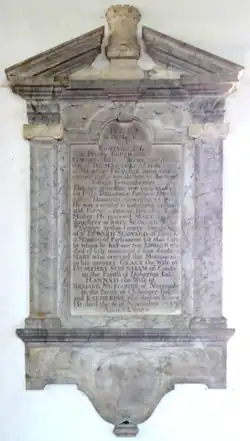 14. ^ His wife's sister, Hannah Hill, married Richard Nutcombe of Nutcombe in the parish of Clayhanger, Devon, according to the monument in Broadhembury Church to her father Richard Hill (1655–1737) of Kerswell Priory in the parish of Broadhembury, see image File:RichardHill OfKerswellPriory BroadhemburyChurch Devon Died1737.PNG
