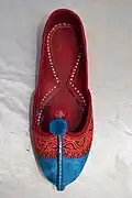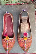 Sindhi Khusso, Multani Khussa or simply just Khussa (Urdu: کُھسّہ), is a traditional footwear[1] produced in Sindh and Multan in Pakistan.[2][3][4] Khussa are hand-made by local artisans mostly using vegetable-tanned leather. The uppers of Khussa are made of one piece of leather or textile, which is embroidered and embellished with brass nails, cowry shells, taunra, mirrors, bells and ceramic beads. Even the bonding from the upper to the sole is done by cotton thread that is not only eco-friendly but also enmeshes the leather fibers with great strength. Some product range also uses bright and ornate threads.[5]