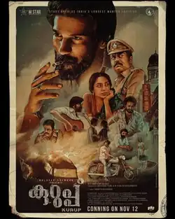 Kurup is a 2021 Indian Malayalam-language biographical period crime thriller film[6] based on fugitive Sukumara Kurup.[7] Produced by Dulquer Salmaan and directed by Srinath Rajendran, it stars Dulquer Salmaan in the title role with an ensemble cast including Indrajith Sukumaran, Shine Tom Chacko, Sunny Wayne, Sobhita Dhulipala, Bharath, Tovino Thomas, Shivajith, Vijayaraghavan, Vijaykumar Prabhakaran, Saiju Kurup and Anupama Parameswaran.