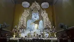 The Kyauktawgyi Buddha is a huge sculpted image of the Buddha seated in the Bhūmipassa Mudrā (ဘူဖဿမုဒြာ).[1] The figure was sculpted from a single block of pale green marble quarried at Sagyin, 12 miles (19 km) north of Mandalay.[1] The stone block was transported over the course of 13 days, requiring the manpower of 10,000 to 12,000 men, to the temple site, where it was carved. The image was consecrated in 1865.[1]