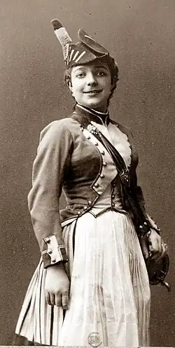 In April 1880 productions opened at the Theater an der Wien in Vienna and the Alhambra Theatre, London.[14] The latter, in an English version by H. B. Farnie, starred Constance Loseby and Fred Leslie, with the role of Griolet played en travesti by Fannie Leslie.[15] The production ran there until January 1881, when it transferred to the Connaught Theatre, with a different cast.[16] The work was given in French at the Shaftesbury Theatre, London, in 1908.[17]