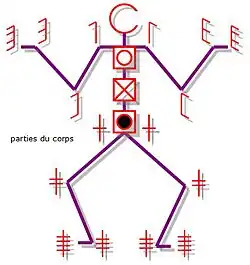 Each "direction symbol" indicates the orientation of a line between the proximal and distal points of a body part or a limb.[7] That is, "the direction signs indicate the direction towards which the limbs must incline".[8]