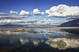 The lake lies at an altitude of 821 m and its area is 73 square kilometres. Its waters fed by streams are used for irrigation for the surrounding agricultural lands and the lake is also an important fishing and aquaculture center at regional scale.