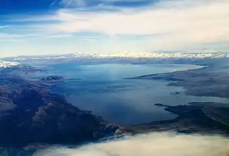 Lake Sevan (Armenian: Սևանա լիճ, romanized: Sevana lich) is the largest body of water in both Armenia and the Caucasus region. It is one of the largest freshwater high-altitude (alpine) lakes in Eurasia.[7] The lake is situated in Gegharkunik Province, at an altitude of 1,900 m (6,234 ft) above sea level. The total surface area of its basin is about 5,000 km2 (1,900 sq mi), which makes up 1⁄6 of Armenia's territory.[7] The lake itself is 1,242 km2 (480 sq mi), and the volume is 32.8 km3 (7.9 cu mi).[3] It is fed by 28 rivers and streams. Only 10% of the incoming water is drained by the Hrazdan River, while the remaining 90% evaporates.