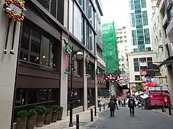 Lan Kwai Fong (Chinese: 蘭桂坊), often abbreviated as LKF, is a small square of streets in Central, Hong Kong. The area was dedicated to hawkers before the Second World War, but underwent a renaissance in the mid-1980s. It is now a popular expatriate haunt in Hong Kong for drinking, clubbing, and dining. The street Lan Kwai Fong is L-shaped with two ends joining with D'Aguilar Street.[1]