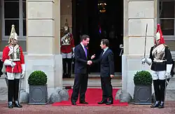 The Lancaster House Treaties (French: Traités de Londres, lit. 'Treaties of London') of 2010 are two treaties between the United Kingdom and France for defence and security cooperation.[1][2] They were signed at 10 Downing Street on 2 November 2010 by British prime minister David Cameron and French President Nicolas Sarkozy.[3] The two treaties collectively are sometimes referred to as the Lancaster House Agreement.