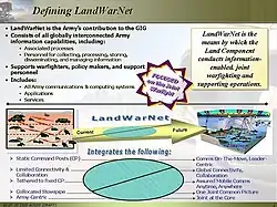 LandWarNet (LWN) is the United States Army’s contribution to the Global Information Grid (GIG) that consists of all globally interconnected, end-to-end set of Army information capabilities, associated processes, and personnel for collecting, processing, storing, disseminating, and managing information on demand supporting warfighters, policy makers, and support personnel. It includes all Army (owned and leased) and leveraged Department of Defense (DOD)/Joint communications and computing systems and services, software (including applications), data security services, and other associated services.[1] LandWarNet exists to enable the warfighter through Mission Command, previously described as Battle Command.[2] Other U.S. service equivalent efforts to LandWarNet include the Navy's "FORCEnet" and the Air Force's "C2 Constellation."[3]