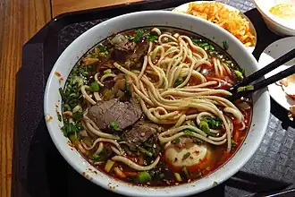 Lanzhou beef noodles are named after the city of Lanzhou, in Gansu province, which stretches to the Yellow River and was a stop on the ancient Silk Road. During the Tang dynasty, the Muslim Hui people developed a variation of beef noodle soup noodle that is compatible with the Muslim diet, with easy-to-prepare ingredients.[1][2][3] Local lore attributes its creation to Ma Baozi (马宝子), a Hui Chinese man from Lanzhou.[4] There are numerous beef noodle soups available in China, with a wider variety in the west than the east.