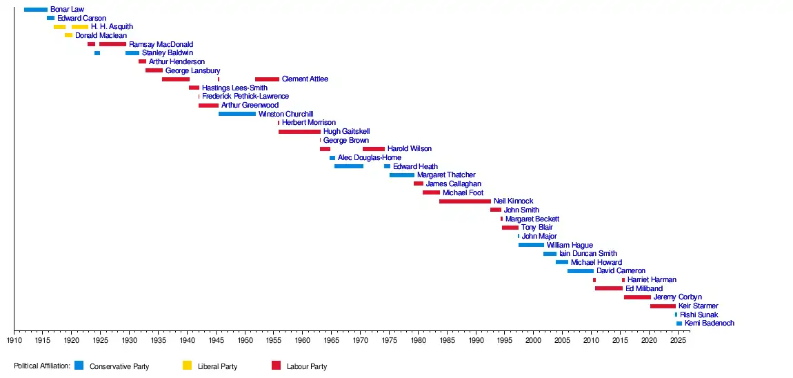 The leaders of the two Houses were of equal status, before 1911, unless one was the most recent Prime Minister for the party. Such a former prime minister was considered to be the overall leader of the opposition. From 1911 the Leader of the Opposition in the House of Commons was considered to be the overall Leader of the Opposition. Overall leaders names are bolded. Acting leaders names are in italics unless the acting leader subsequently became a full leader during a continuous period as leader.