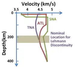The Lehmann discontinuity is an abrupt increase of P-wave and S-wave velocities at the depth of 220 km (140 mi)[2] in Earth's mantle, discovered by seismologist Inge Lehmann.[3][4][5] It appears beneath continents, but not usually beneath oceans,[6] and does not readily appear in globally averaged studies. Several explanations have been proposed: a lower limit to the pliable asthenosphere, a phase transition,[7] and most plausibly, depth variation in the shear wave anisotropy.[8]