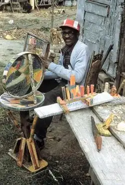 Person's works frequently employ images of trees, animals, his tools, and circles (which often resemble saw blades), letters and numerals of his own creation.[1] His work has often been compared to Sub-Saharan African sculpture for its dense geometric patterns.[2] William Arnett likened his freestanding sculptures to that of the Dogon people of Mali[1] while Colin Rhodes compared his furniture to the Bambara people of the African Niger River region.[3] Despite these comparisons, Person's works are sui generis. They are simultaneously a product of centuries of African culture in America and his life spent virtual isolation in Ochineechee Neck.[4]