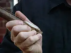 The term lesiba (Tswana for 'feather') refers to a class of "unbraced mouth-resonated bow[s]"[3] with a flattened quill attached to a long string, stretched over a hard stick, acting as the main source of vibration. Holding both hands around the quill, positioned without touching just inside the lips, the player sharply inhales or exhales against it, creating vibration in the string.[4] This "produces a powerful buzzing sound,"[3] usually in short notes on a small, limited scale.