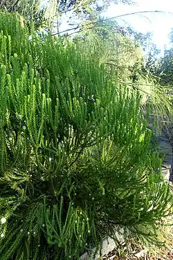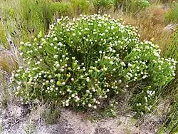 The shrub grows 2 m (6.6 ft) tall and bears flowers in September to October. Fire destroys the plant but the seeds survive. The seeds are stored in a toll on the female plant and are released where they fall to the ground and are possibly spread by the wind. The plant is unisexual and there are male and female plants. Insects do the pollination.