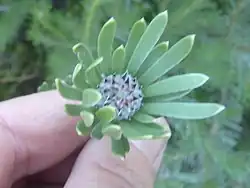 Leucadendron singulare, the Kammanassie conebush, is a flower-bearing shrub belonging to the genus Leucadendron and forms part of the fynbos. The plant is native to the Western Cape where it occurs in the Mannetjiesberg in the Kammanassie Mountains. The plant is rare. The shrub grows only 30 cm high and spreads out. It blooms in October. The plant dies after a fire, but the seeds survive. The seeds are stored in a toll on the female plant and fall out of the toll to the ground after two months where they are spread by ants. The plant is single-faced and there are separate plants with male and female flowers, which are pollinated by insects. The plant grows in crevices on peaks at heights of 2,000 - 2,150 m.