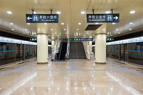 Lianhua Qiao station[1] (simplified Chinese: 莲花桥站; traditional Chinese: 蓮花橋站; pinyin: Liánhuā Qiáo zhàn) is a station on Line 10 of the Beijing Subway.[2][3] This station opened on December 30, 2012.[4] It will be an interchange station between Line 10 and Line 11 (Phase 2).[5][6] The station is named after the nearby grade-separated junction called Lianhua Bridge.