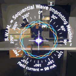 When the S.W.I.M. is waved in a circular motion rather than reciprocally waved back-and-forth, the tracking system only needs to determine speed, but not direction, and is therefore much easier to implement, not requiring a quadrature detector or direction detector or the like. Such rotary S.W.I.M. is often mounted onto the shaft of a motor, so that it does not need to be waved back-and-forth by hand. In this configuration it can continuously display images, text, graphics, and graphs, such as a plot of the rotating magnetic field in the motor, or its rotor current, in coordinates in which the rotary motion of the motor is cancelled out, so as to make visible various functional aspects of the motor in real-time.[39] Rotary S.W.I.M. is also used for realtime visualization of audio, brain activity, and meditation.[40]