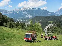Lindner truck and tractor harvesting hay in Swiss Alps