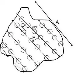 The method is commonly used for forest inventories. It makes it possible to accurately estimate the volume standing in a forested tract without counting every single item. Inventory specialists set up a line bearing on their hand compass and determine how many plots to take on this survey line. This is done by determining the distance between survey lines (B), the distance between plots (D), and the surface area (A) of the tract. The number of samples that should be taken is then calculated as follows: