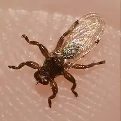 When the fly has completed its metamorphosis, the winged adult emerges and begins searching for a host. Adults can only fly approximately 50 meters, so their success depends on the density and distribution of the host mammals. Once the fly has found a suitable host, it sheds its wings. The rest of its lifecycle, including reproduction, occurs on the host.[2]