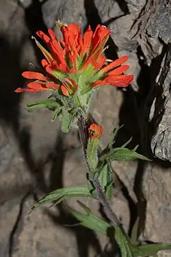 This is a list of the species in the genus Castilleja. They are commonly called paintbrushes,[1] painted-cups, or owl’s-clovers in English.[2] These 218 species and two natural hybrids are considered valid by Plants of the World Online (POWO) as of 2024.[3] This list largely agrees with World Flora Online (WFO) with some exceptions. WFO lists Castilleja eggeri as unchecked.[4] It also spells some species names differently, Castilleja rhexiifolia with a single "i" instead of a double "ii", Castilleja tolucensis as Castilleja toluccensis, and Castilleja virgatoides as Castilleja virgayoides.[5][3] In addition one of the two hybrids, Castilleja × cognata, is listed in WFO as a species rather than as a hybrid.[6]