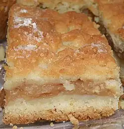 | Szarlotka | Apple cake called szarlotka or jabłecznik is made from sweet crust pastry and spiced apple filling. It can be topped with kruszonka (crumbles), meringue, or a dusting of caster (powdered) sugar. An additional layer of budyń (milk kissel) sometimes can be found. In restaurants and cafes, it is usually served hot with whipped cream and coffee. | |