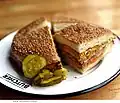 Muffuletta Sesame-seed bread, or the layered New Orleans sandwich made with it, stuffed with sausage meats, cheese, olive salad, and other ingredients
