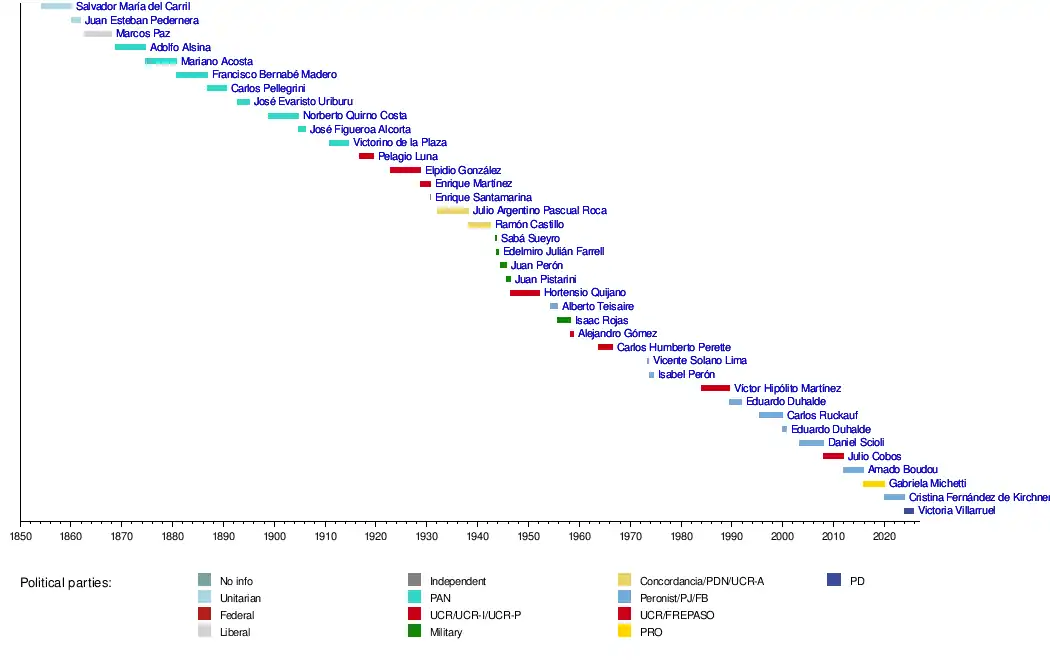 Victoria VillarruelCristina Fernández de KirchnerGabriela MichettiAmado BoudouJulio CobosDaniel ScioliEduardo DuhaldeCarlos RuckaufEduardo DuhaldeVíctor Hipólito MartínezIsabel PerónVicente Solano LimaCarlos Humberto PeretteAlejandro GómezIsaac RojasAlberto TeisaireHortensio QuijanoJuan PistariniJuan PerónEdelmiro Julián FarrellSabá SueyroRamón CastilloJulio Argentino Pascual RocaEnrique SantamarinaEnrique MartínezElpidio GonzálezPelagio LunaVictorino de la PlazaJosé Figueroa AlcortaNorberto Quirno CostaJosé Evaristo UriburuCarlos PellegriniFrancisco Bernabé MaderoMariano Acosta (politician)Adolfo AlsinaMarcos PazJuan Esteban PederneraSalvador María del Carril