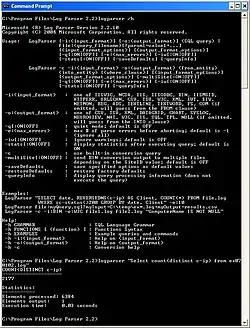 logparser is a flexible command line utility that was initially written by Gabriele Giuseppini,[1] a Microsoft employee, to automate tests for IIS logging. It was intended for use with the Windows operating system, and was included with the IIS 6.0 Resource Kit Tools. The default behavior of logparser works like a "data processing pipeline", by taking an SQL expression on the command line, and outputting the lines containing matches for the SQL expression.
