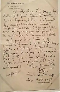 Made in Paris in my office, 24 rue Copernic twenty-four July 1933, Read and approved: Rabbi Louis-Germain Lévy, Arnold Schoenberg