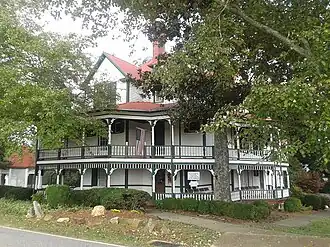 The Lucas Mansion, also known as the Hiddenite Center, is a historic home located at Hiddenite, Alexander County, North Carolina. It was built about 1900, and is a three-story, frame Queen Anne style dwelling. It features a two-story wraparound porch. It was enlarged to its present size by 1928. Local tradition says the house was enlarged twice by raising the existing floor and building a new floor beneath or between the existing floors. The house roughly follows a cruciform plan, though the plan varies from floor to floor. It was owned by James Paul Lucas, a South Carolina native and international diamond merchant.[2]