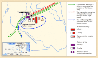 In the summer of 68 BC Lucullus resumed the war against Tigranes, crossing the Anti-Taurus Range in a long march through very difficult mountain country directed at the old Armenian capital Artaxata. A battle took place near the River Arsanias, where Lucullus once again routed the Armenian royal army.[34] However, he had misjudged the time needed for a campaign so far into the Armenian Tablelands, where the good weather was unusually short lived, and when the first snows fell around the time of the autumn equinox his army mutinied and refused to advance any further. Lucullus led them back south to the warmer climes of northern Mesopotamia and had no trouble from his troops there despite setting them the difficult task of capturing the great Armenian fortress of Nisibis, which was quickly stormed and made the Roman base for the winter of 68–67 BC.