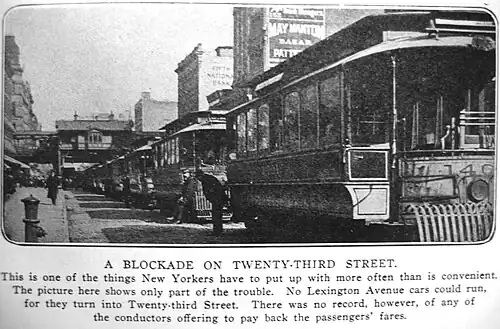 The Twenty-third Street Railway was a street railway that was originally operated as horse cars and later electric traction. The company was chartered on January 29, 1872.[6] Its trackage ran along 23rd Street between 13th Avenue at the Hudson River and the East River east of Avenue A, with a depot on the north side of 23rd Street between 13th and 11th Avenues. Most of this trackage was built by the Twenty-third Street Railway, with three exceptions: a double-track segment between Broadway and Fourth Avenue, built as per an 1860 grant by the Forty-second Street and Grand Street Ferry Railroad; another double-track portion between First Avenue and the former Asser Levy Place, built under another 1860 grant by the Central Park, North and East River Railroad Company; and a single-track portion between Second and First Avenues, built as per a grant awarded to the Second Avenue Railroad in 1852 and confirmed in 1854. In the last instance, the Twenty-third Street Railway removed the Second Avenue Railroad track in the middle of the street, and added double tracks on the curbside of the street, of which the eastbound track was to be shared with the Second Avenue Railroad.[7]: 287