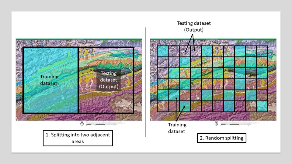 As the training of machine learning for landslide susceptibility mapping requires both training and testing datasets, splitting the dataset is required. Two splitting methods for the datasets are presented on the geological map of the east Cumberland Gap. The method presented on the left, 'Splitting into two adjacent areas', is more useful as the automation algorithm can carry out mapping of a new area with the input of expert processed data of adjacent land. The cyan pixels show the training dataset while the remaining show the testing.