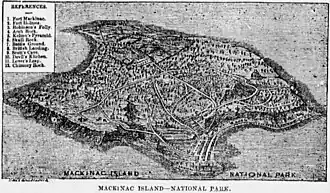 Mackinac National Park was a United States national park that existed from 1875 to 1895 on Mackinac Island in northern Michigan, making it the second U.S. national park after Yellowstone National Park. The 1,044-acre (422 ha) park was created in response to the growing popularity of the island as a summer resort. Its creation was largely the result of efforts by United States Senator Thomas W. Ferry, a native of the island. Senate Bill 28 "to set aside a certain portion of the island of Mackinaw and the straits of Mackinaw, within the State of Michigan as a national park" was introduced December 2, 1874, and signed by President Ulysses S. Grant on March 3, 1875.[1][2] The national park covered 821 acres (332 ha) while the fort retained 103 acres (42 ha) and the remainder of the island was privately owned.[3]
