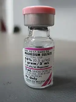 1. ^ a b c d e "Magnesium Sulfate". The American Society of Health-System Pharmacists. Archived from the original on 21 May 2016. Retrieved 8 January 2017.