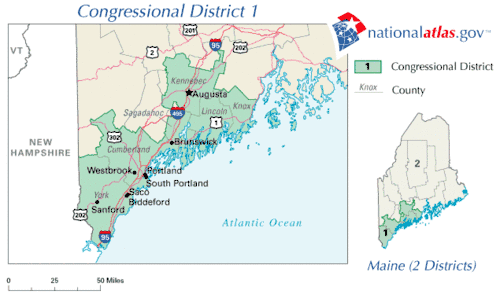 Maine's 1st congressional district is a congressional district in the U.S. state of Maine. The geographically smaller of the state's two congressional districts, the district covers the southern coastal area of the state. The district consists of all of Cumberland, Knox, Lincoln, Sagadahoc, and York counties, and most of Kennebec County. Located within the district are the cities of Portland, Brunswick, and Saco. The district is currently represented by Democrat Chellie Pingree.