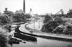 Most of the traffic along the canal transported coal from the many collieries that existed along its length, such as Outwood Colliery and Ladyshore Colliery. Some of these pits were linked to the canal by road, and some by short tramlines.[37][38] In the late 19th century as much as 650,000 metric tons (640,000 long tons) of coal and 43,000 metric tons (42,000 long tons) of other materials[39] including night soil[40] and fruit[41] were transported annually. The canal also enabled the transport of salt from Cheshire to the many bleach and dye works in its area – hence the name of Salt Wharf on the Bolton arm of the canal. Tolls were easily calculated as milestones were placed along the towpath at 1⁄4 mile (400 m) intervals. This was important as journeys were often quite short, the collieries being so close to industry along the canal's length.[42]