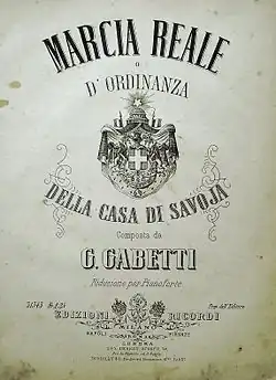 The "Marcia Reale d'Ordinanza" (Italian pronunciation: [ˈmartʃa reˈaːle dordiˈnantsa]; "Royal March of Ordinance"), or "Fanfara Reale" (Italian: [faɱˈfaːra reˈaːle]; "Royal Fanfare"), was the official national anthem of the Kingdom of Italy between 1861 and 1946.[1] It was composed in 1831 by Giuseppe Gabetti to the order of Charles Albert of Sardinia as the hymn of the royal House of Savoy, along with the Sardinian national anthem. It remained a famous, recognizable and cherished symbol of Italy throughout the history of the monarchy.