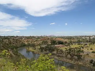 The river flows south and west. At Keilor the river winds back on itself in a giant horseshoe bend, before winding south again at Brimbank Park. Here the river flows 55 metres (180 ft) below the western plains. Brimbank Park forms a huge amphitheatre in the bend in the river with picnic areas, cycle and walking trails, and a café, that is usually busy on weekends and holidays. The area is rich in birdlife and native fauna. The Maribyrnong River Trail shared path starts at Brimbank Park, following mostly beside the river to near its confluence with the Yarra River in Footscray. At Avondale Heights and Essendon West residents have views over the river valley to the skyscrapers of the Melbourne CBD. Up until this area, the Maribyrnong is unusual in being one of the few large basaltic streams in Victoria. The Maribyrnong is a freshwater river as far downstream as Solomon's Ford, Avondale Heights.[6] Swimming in the river is not permitted downstream of the Canning Street bridge in Avondale Heights.[7]