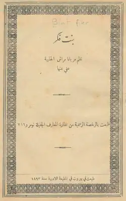 As early as 1870, Marrash started contributing articles and poems to journals—especially Al-Jinan and Lisan al-hal, both of Beirut.[20] In her articles, she criticized the condition of Arab women, urging the latter—regardless of their religious affiliations—to seek education and express themselves on matters of concern to them.[21] Her collection of poetry Bint fikr (A Daughter of Thought) was published in Beirut in 1893. Marrash was granted permission by the Ottoman government to print her book after composing a poem exalting Sultan Abdul Hamid II.[22][b] In some of the several other panegyrics included in the collection, she also praised Ottoman governors of Aleppo.[24] Her poetry was much more traditional in style than her brother Francis', as exemplified by the elegy she composed to lament his death;[25] yet, she was at home with the poetry of French romantics, especially that of Alphonse de Lamartine and Alfred de Musset.[25] Sami Kayyali said about Marrash: